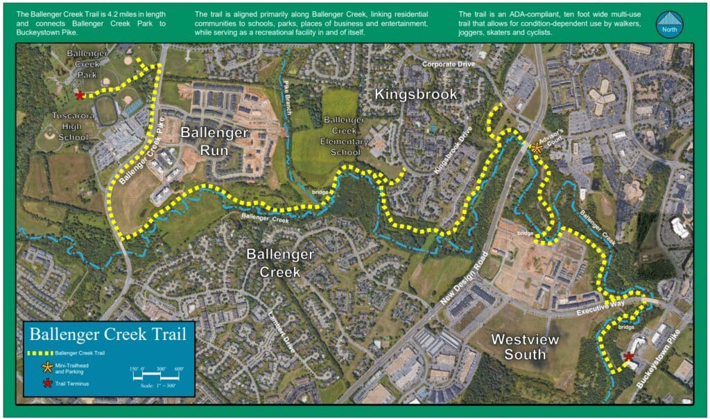 You can start at either end, parking at the Buckeystown Pike parking lot or Ballenger Creek Park. About 1/3 of the way from Buckeystown Pike, there’s an additional trailhead at Advisor’s Court.