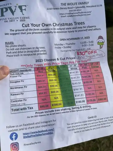 For years my family every year in December went to Snicker’s Gap Christmas Tree farm in Loudoun County, a picture perfect cut-you-own Christmas tree farm. I’ve now found a place in Maryland that is its equal and probably more. Wolfe’s Pine Valley Farm is the best Christmas tree farm near Frederick.