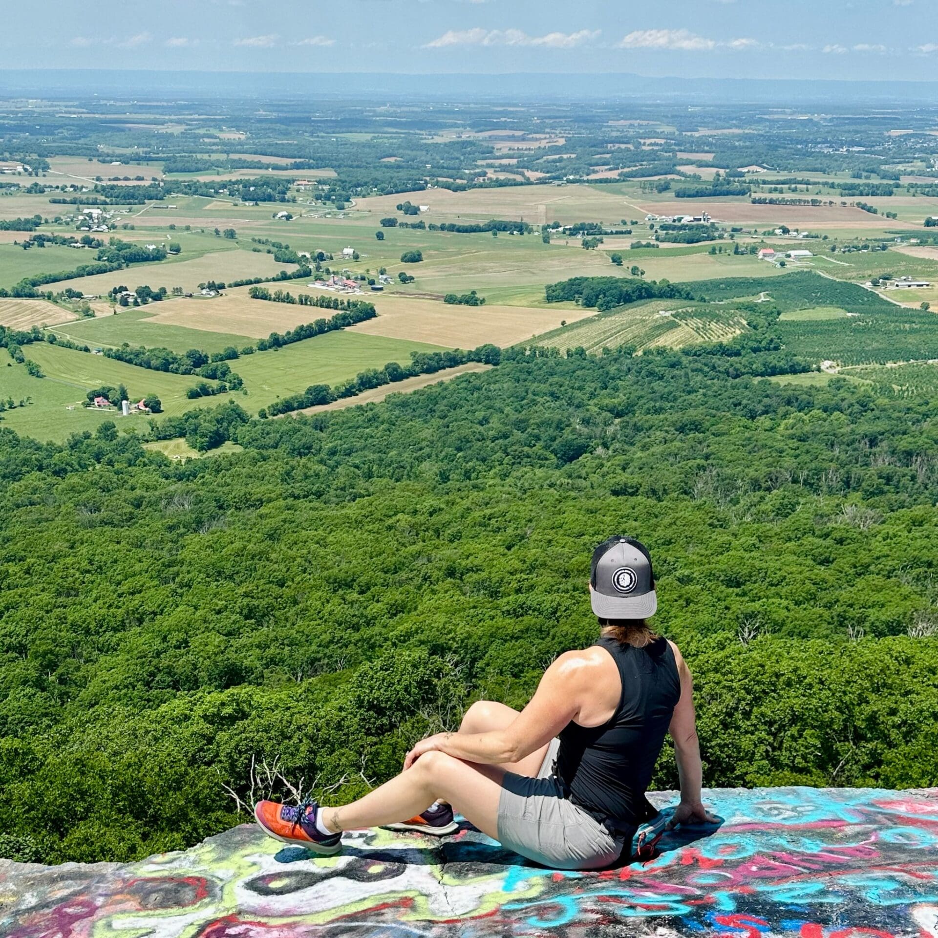 A woman with a ponytail and tan cap sits on a colorful graffiti-covered rock ledge, enjoying one of the best hikes around Frederick MD, as she overlooks green fields and forests under a bright blue sky with scattered clouds.