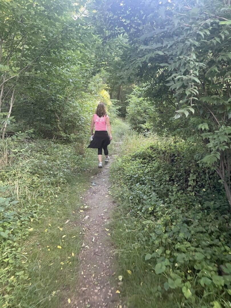 A person with light brown hair walks alone on a sunlit dirt trail through a tall, dense Mt Airy MD forest. They wear a black jacket tied around their waist. Sunlight filters through the pine trees, and a trail sign stands on the right.