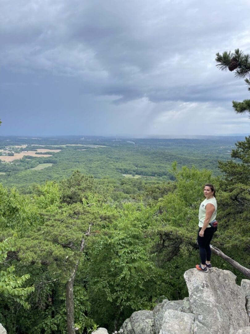 A person with arms outstretched stands on a large rocky ledge next to a massive boulder—perhaps discovering one of the best hikes around Frederick MD. They wear a red shirt and teal shorts, framed by misty mountains and forest in the cloudy background.