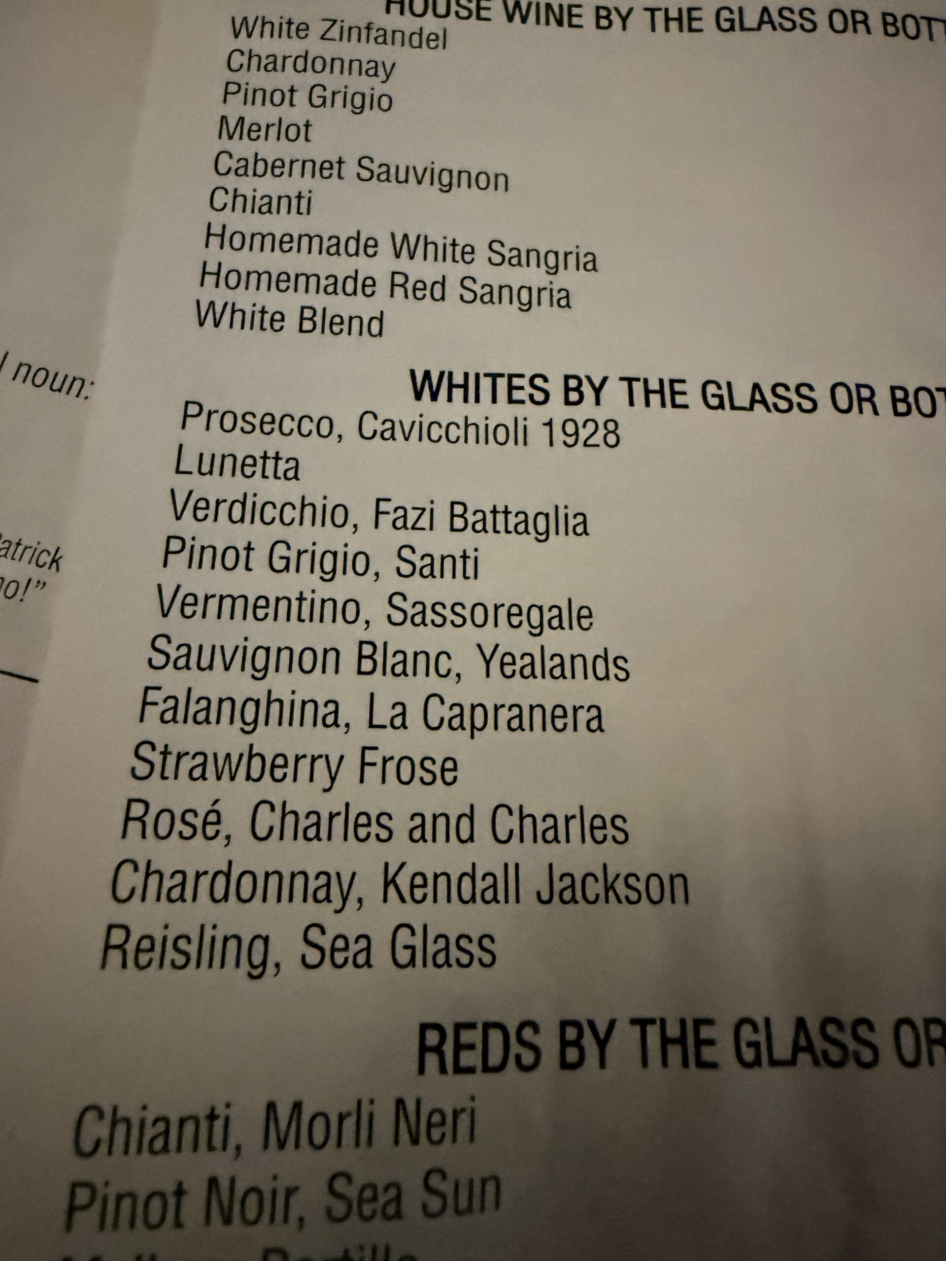 But all the white and red Italians are covered by the glass or bottle: Pinot Grigio, Verdicchio, Chianti, and Cabernet Sauvignon.