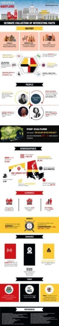 But Frederick is also interesting. It has a unique American history. Its vibrant culture, people, demographics, economics, arts, and sports make a place bursting with character. The Infographic below is a collection of the most Interesting Facts About Frederick Maryland.