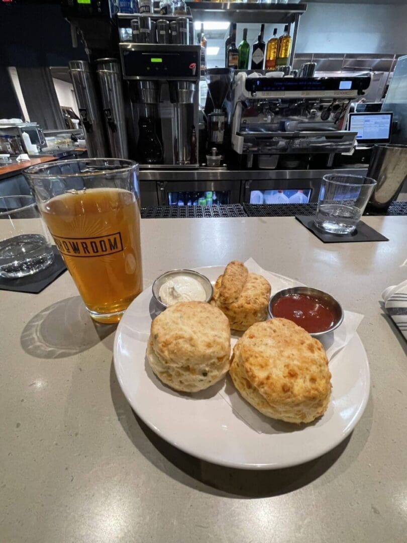 Somehow, this modern diner theme all comes together beautifully to make Showroom a superb place to dine. The dishes are mostly upscale plays off comfort food. Fried Chicken with Cheddar Chive Biscuits. Meatloaf with Mushroom Gravy. Plus Burgers, a Reuben, and the Nashville Hot Chicken Sandwich (a fried chicken thigh topped with peppers and pickles).