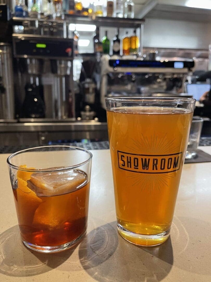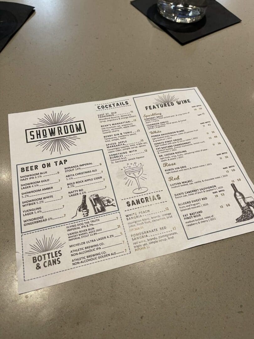 Part of what raises the profile of Showroom is the drink menu. Order one of their specialty cocktails like the E Street Old Fashion or the McCutcheon’s Mule, and a server will mix it behind the counter. The wine list has several quality old world and new world wines. There are always multiple craft beers and ciders on tap, including locals like those from Rockwell.
