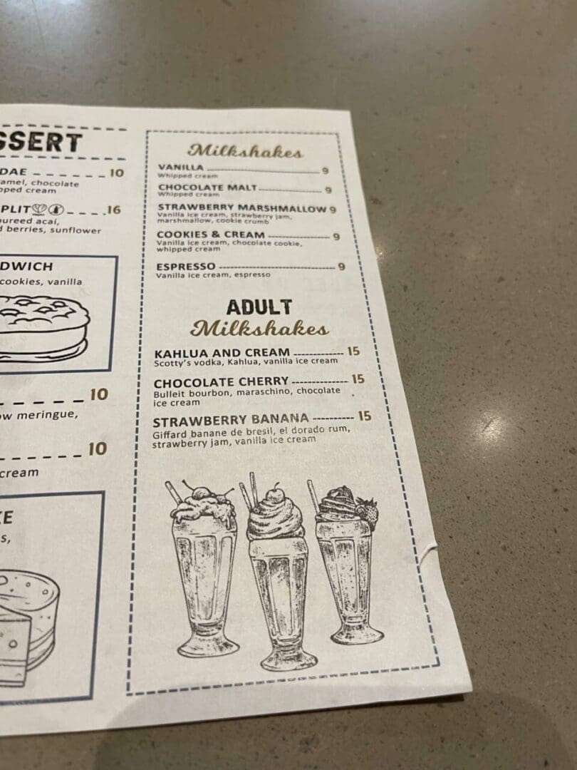 This is a modern, classy restaurant. There are craft cocktails and a fine wine list. Local beers are on tap, and something called ‘adult milkshakes’ (read below). The comfort food and roadside diner characteristics are all there. But this food is elevated, modern, and upscale. Are you dressed appropriately to eat here?
