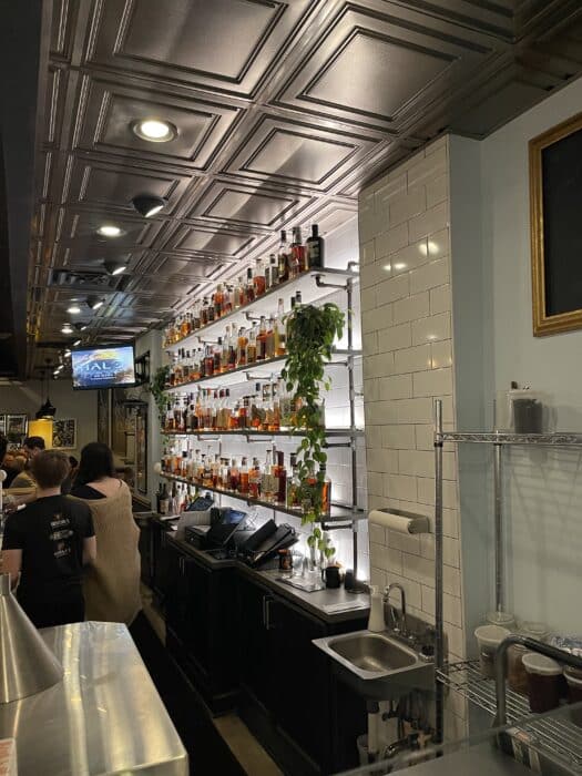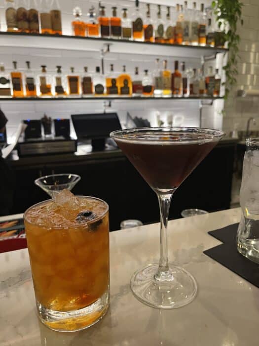The white marble top bar and backlit bottles give it a glimmering vibe, the very opposite of so many dark, noisy, basement-type bars. Its connected to Firestone’s and you’ll see servers going back and forth serving up food, while the bartenders are busy mixing and serving up drinks.
