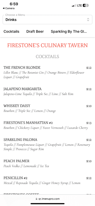 - Food: The Full Firestone’s Culinary Tavern menu is available