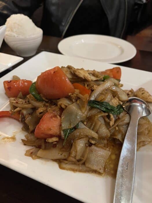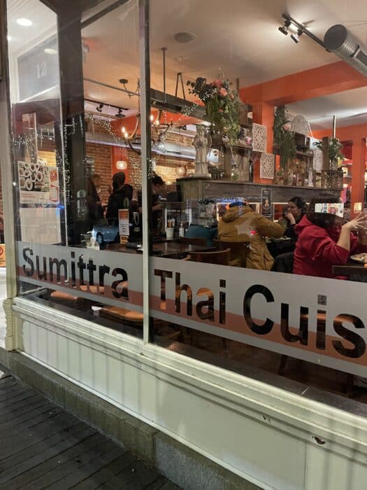 Sumittra Thai makes itself known in this hub with its bright orange canopy and often a line of diners waiting outside. It sits right under another Asian restaurant, LazyFish, which focuses on sushi.